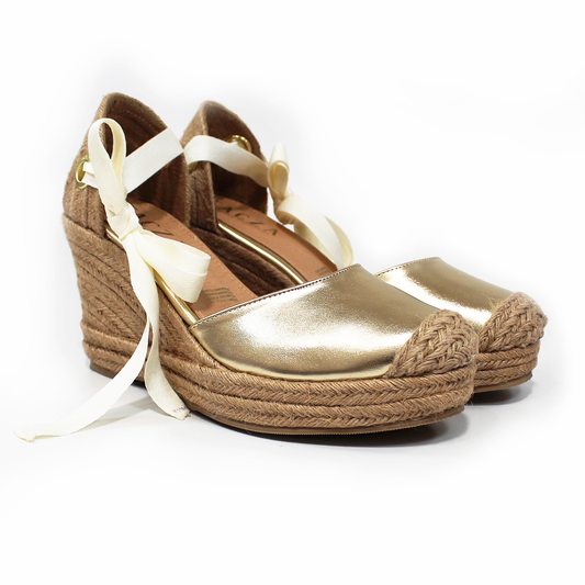 Alpargata Clásica de Plataforma Cuña con Lazos color Oro Metálico y Punta con Yute TACZA