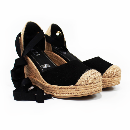 Alpargata Clásica de Plataforma Cuña con Lazos color Negro y Punta con Yute TACZA