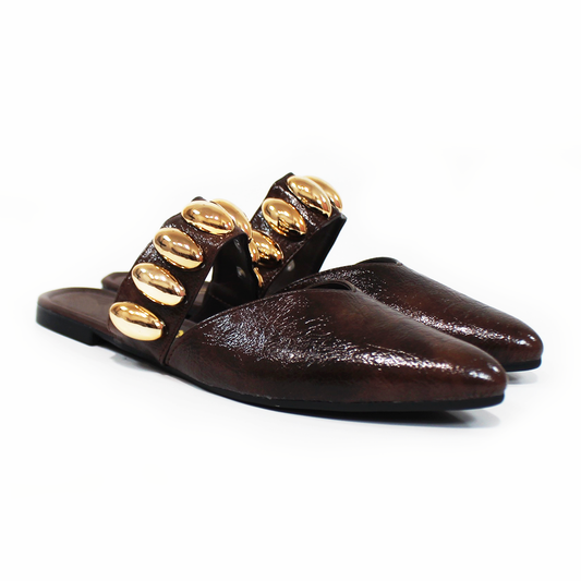 Mule Chocolate de piso con tira de Botones Dorados de Dama