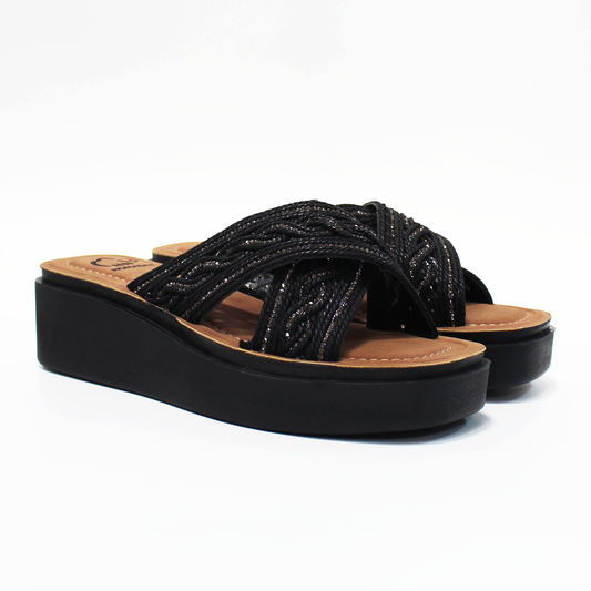 Sandalia de Plataforma Cruzada con Pedrería Negra de Dama NOMADAS
