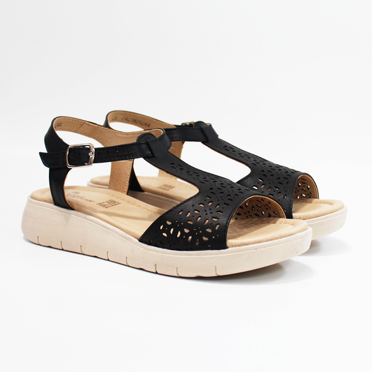 Sandalia Confort de Piel Perforado con Hebilla Negro de Dama SUAVE CAMINAR