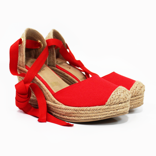 Alpargata Clásica de Plataforma Cuña con Lazos color Rojo y Punta con Yute TACZA
