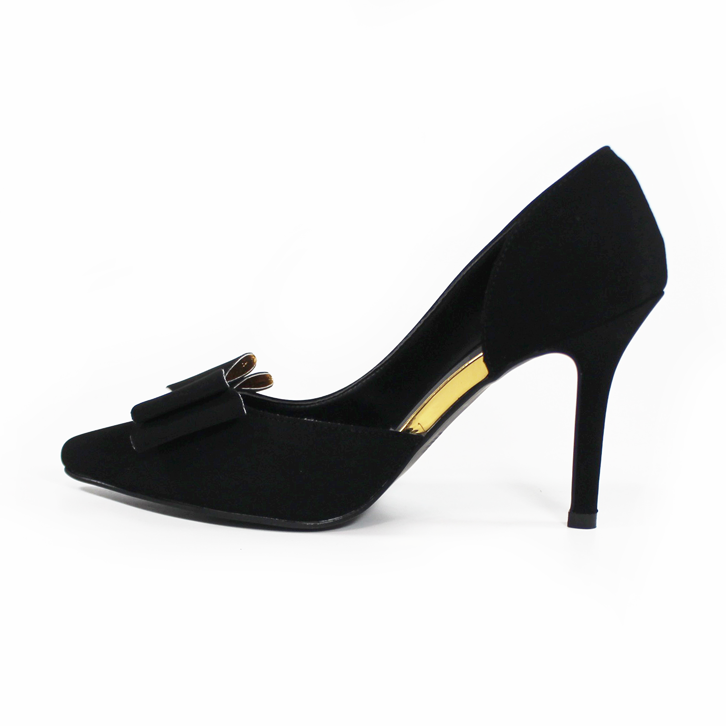 Stiletto Negro Ante Lateral Semiabierto con Moño y Detalles Dorados LADY PAULINA