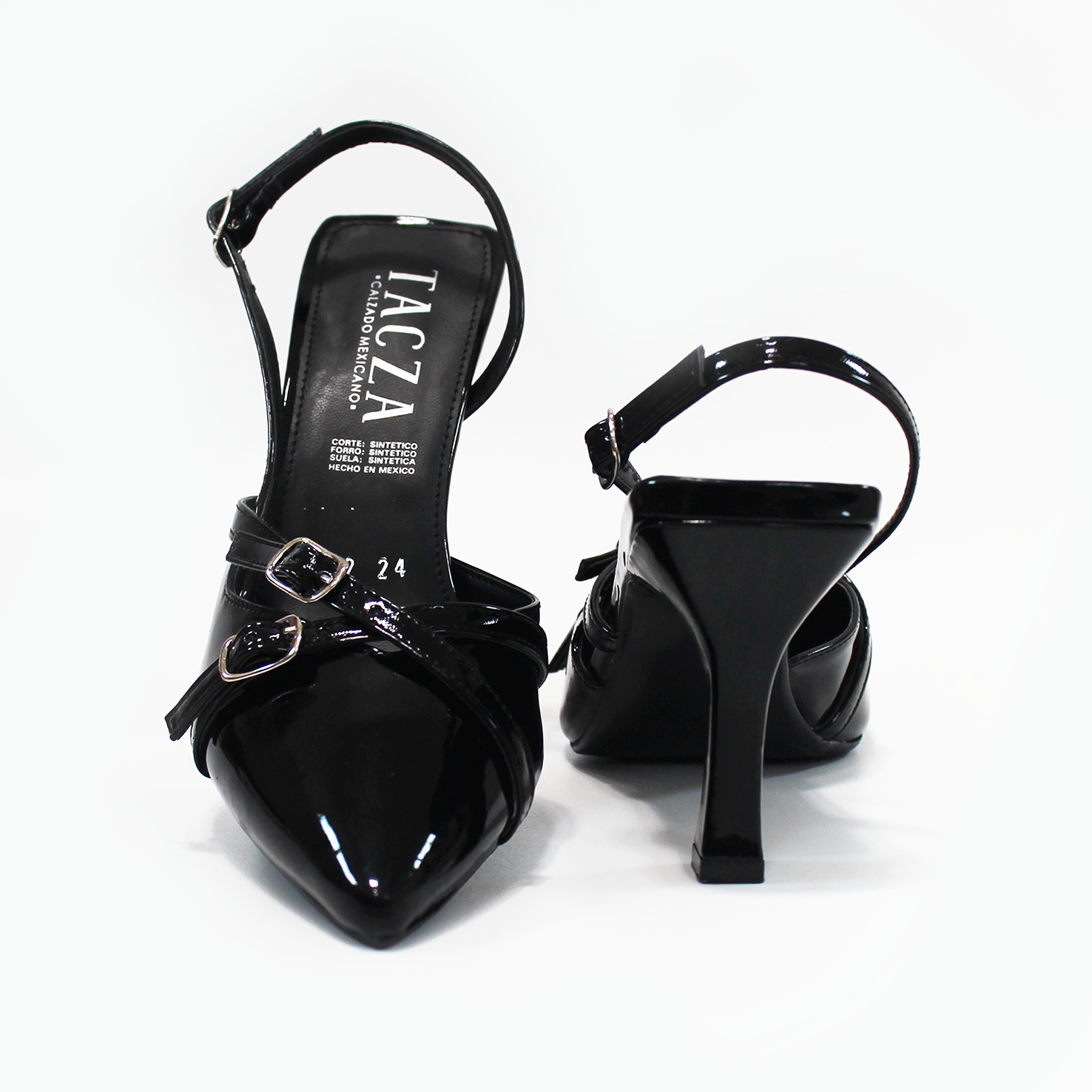Zapatilla Slingbak Destalonada con Tiras Cruzadas y Hebillas Negro Charol de Dama TACZA
